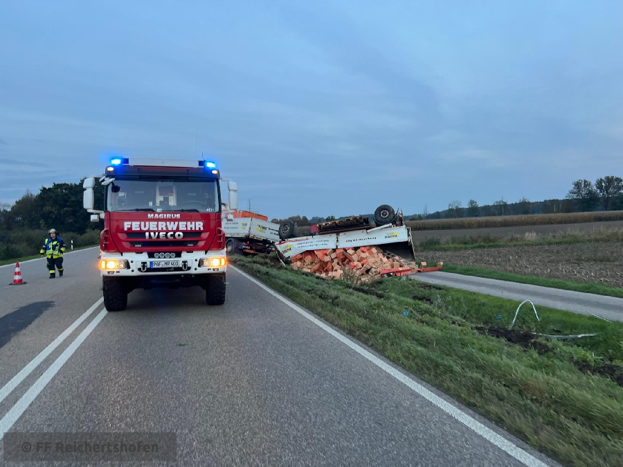 Ein LKW mit Anhänger ist von der Straße abgekommen. Der Anhänger überschlug sich und verlor seine Ladung.