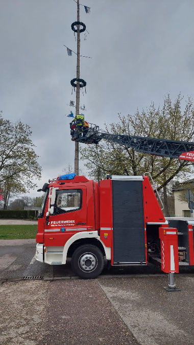 Unterstützung mit der Drehleiter beim Abbau des Maibaums
