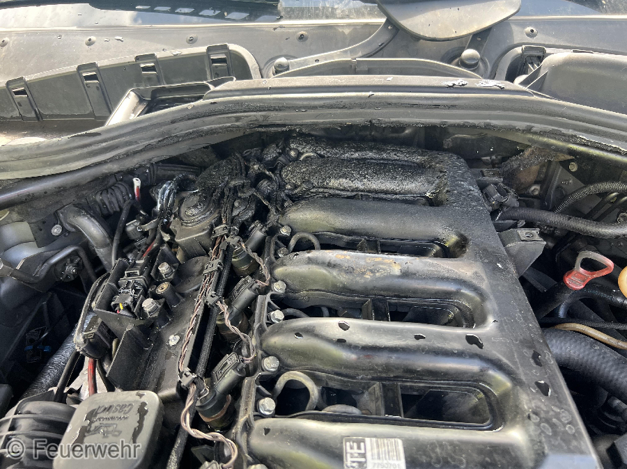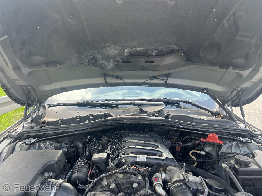 Der PKW stand schon auf dem Abbiegestreifen zur B13. Die Beiden Insassen konnten mit mehreren Flaschen Wasser den Brand im Motorraum bereits löschen.