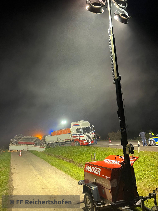Ein LKW mit Anhänger ist von der Straße abgekommen. Der Anhänger überschlug sich und verlor seine Ladung.