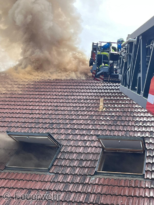 Wir wurden zu einem Dachstuhlbrand alarmiert, alle Personen hatten bereits das Dopplehaus verlassen.
