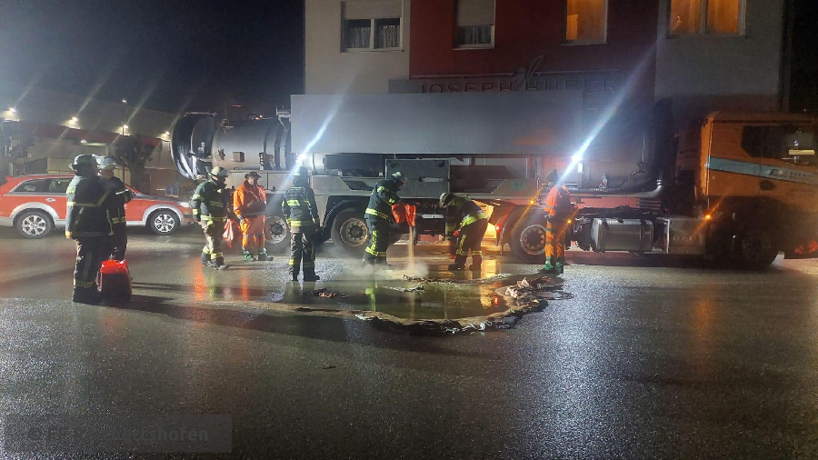 Bei eienm LKW ist der Hydraukilschlauch geplatzt - Öl wurde gebunden