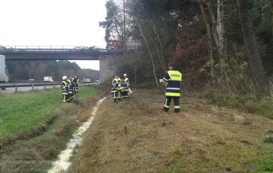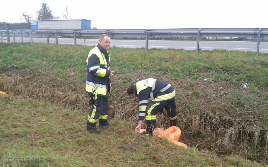Die Feuerwehr Reichertshofen wurde heute Nachmittag auf die Verbindungsstraße Baar/Forstwiesen, Höhe Autobahnbrücke BAB 9, alarmiert. Dort wurde ausgelaufener Dieselkraftstoff in einem Entwässerungsgraben festgestellt. Verursacht wurde dieser Austritt vermutlich durch einen LKW-Unfall, der sich in den Morgenstunden dort ereignet hat. Der Krafstoff wurde mit einem speziellen Ölbindemittel gebunden und mit Ölfliese aufgenommen. Das kontaminierte Erdreich wird durch eine Spezialfirma abgetragen und entsorgt. Die Autobahnmeisterei war vor Ort.